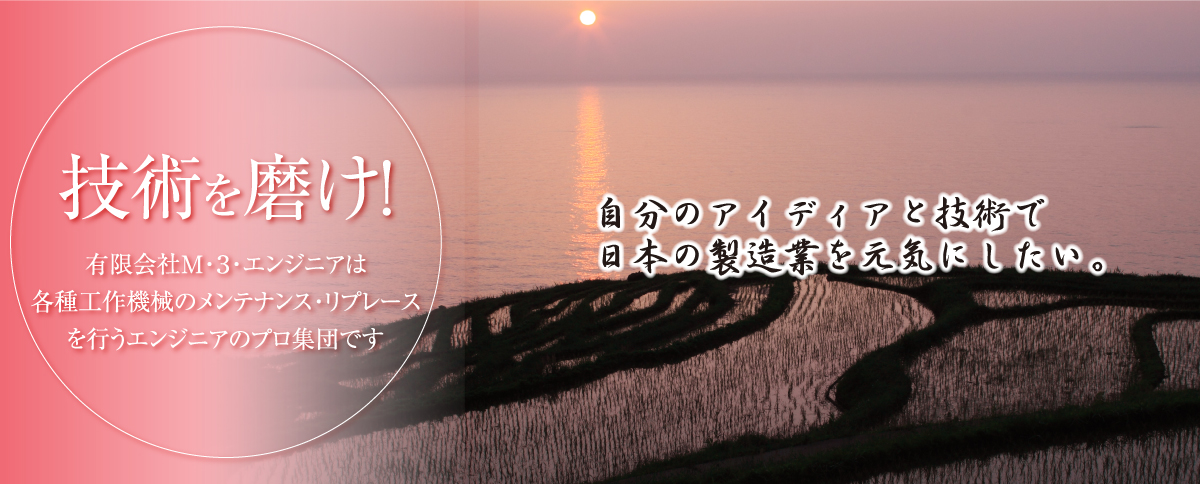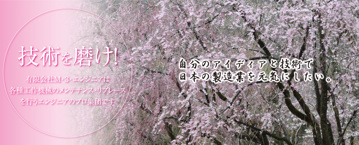 M3エンジニア(M・3エンジニア/エムスリーエンジニア)は工作機械のオーバーホールを承っております。オーバーホールとは機械製品を部品単位まで分解して掃除や調整等を行い、再度組み立てて新品時の性能に戻したり近づけたりする作業や点検の事です。オーバーホールによって機械の精度や生産性は向上します。M3エンジニア(M・3エンジニア/エムスリーエンジニア)では工作機械のオーバーホールについて知識・経験共に豊富なエンジニアがマシンを甦らせます。毎日お使いの工作機械や長年眠っている設備機械をオーバーホールに出してみませんか?工作機械のオーバーホールに関するご相談はM3エンジニア(M・3エンジニア/エムスリーエンジニア)にお気軽にお問い合わせ下さい。また、M3エンジニア(M・3エンジニア/エムスリーエンジニア)では求人(リクルート)を募集しております。機械やモノ作りに興味のある方を募集中です。また、前向きでやる気のある方を求めています。一緒にモノ作りの道を究めませんか?私たちのアイディアと技術で日本の製造業を元気にしましょう!気になった方はお電話、またはメールにてお問い合わせ下さい。